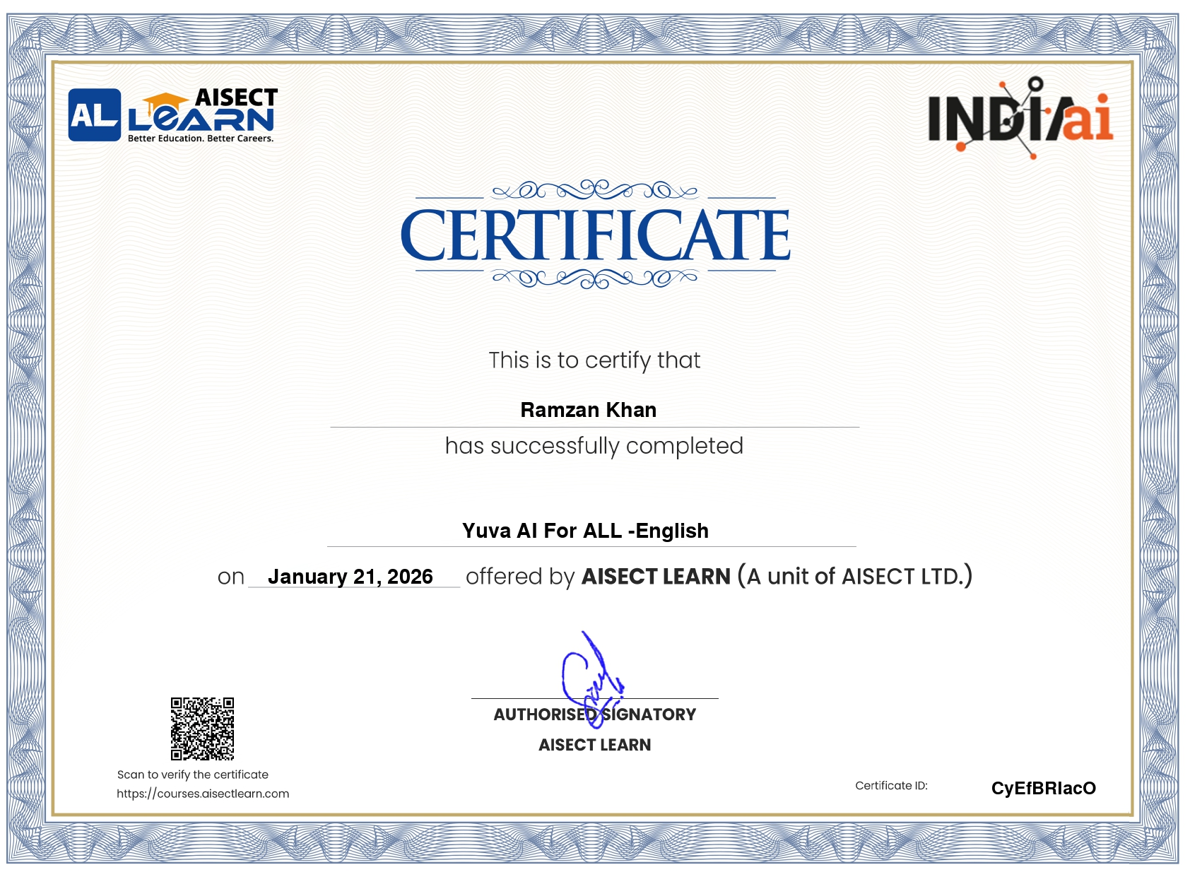 Hey, I'm Ramzan Khan — currently studying at Nexcore Institute of Technology, diving deep into the world of Artificial Intelligence and Machine Learning.